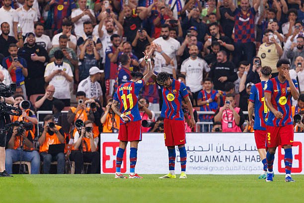 JEDDAH, SAUDI ARABIA – JANUARY 11: Raphinha Dias of FC Barcelona celebrates his goal with teammate Lamine Yamal during the Spanish Super Cup Final match between FC Barcelona and Real Madrid CF at King Abdullah Sports City Hall Stadium on January 11, 2026 in Jeddah, Saudi Arabia. (Photo by Maciej Rogowski/Eurasia Sport Images/Getty Images)