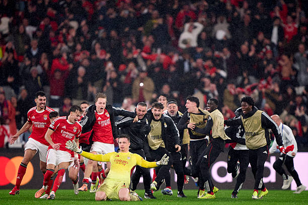 LISBON, PORTUGAL – JANUARY 28: Anatoliy Trubin of Benfica celebrates scoring his team’s fourth goal with teammates during the UEFA Champions League 2025/26 League Phase MD8 match between SL Benfica and Real Madrid C.F. at Estadio Da Luz on January 28, 2026 in Lisbon, Portugal. (Photo by Jose Manuel Alvarez Rey/Getty Images)